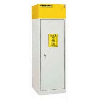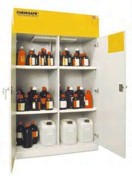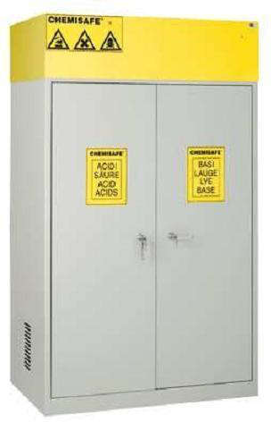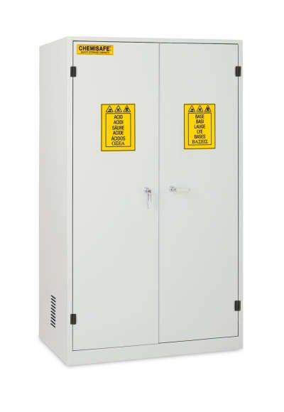 Armadio di sicurezza per prodotti chimici, acidi e basi non infiammabili – 2 porte. 3 ripiani in acciaio plastificato: carico max 80 Kg. Dimensioni: 120 x 60 x 195 cm. Per laboratori