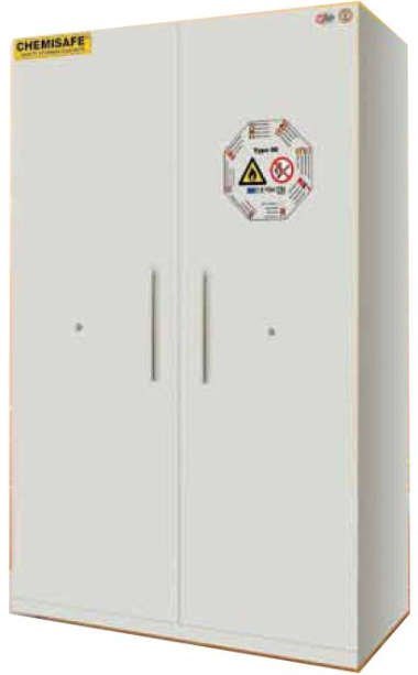 Armadio di sicurezza linea BAC mod. FIRE 120 BAC TYPE 90 per lo stoccaggio di prodotti liquidi e solidi infiammabili con classe di resistenza al fuoco 90 min. Dim. est. mm 1200x600x2000. 2 porte. 3 ripiani in acciaio verniciato e 1 vasca di ritenzione con griglia