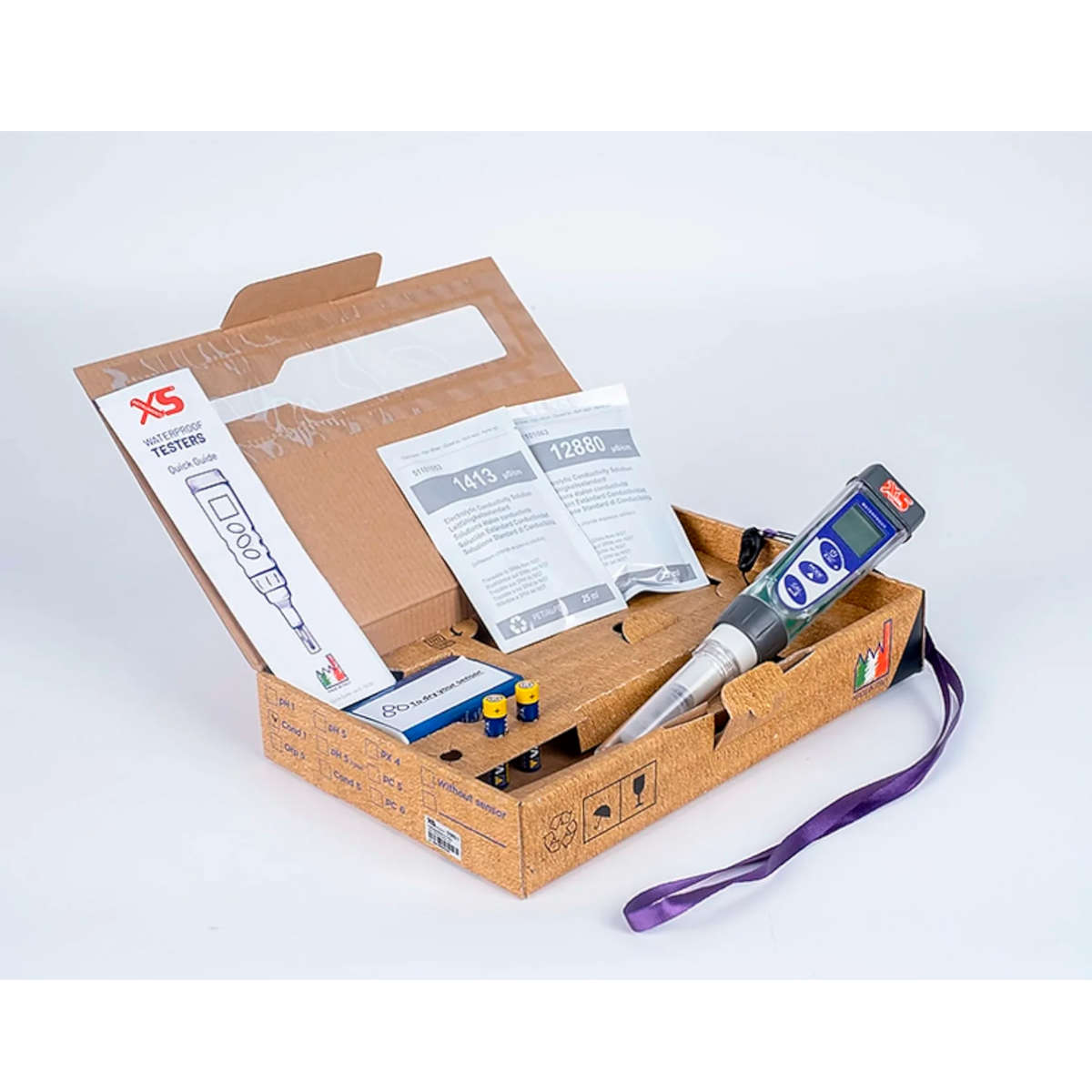 Soluzioni standard 1413 μS e 12,88 mS in bustina da 25 ml, cappuccio per la calibrazione, cinghietta, fazzoletti, istruzioni e valigetta in cartone.