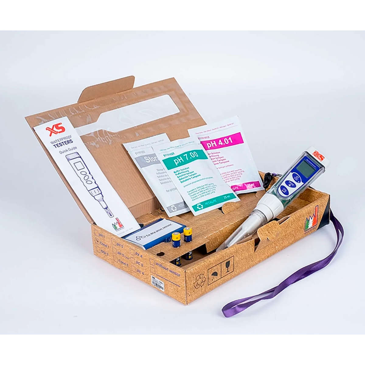 soluzioni tampone pH 7 e pH 4 in bustina da 25 ml, soluzione di conservazione in bustina, cappuccio per la calibrazione, cinghietta, fazzoletti, istruzioni e valigetta in cartone.