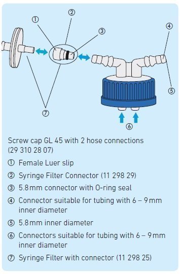 GL 45 cap connection system for the easy connection of flexible tubing to the DURAN® GL 45 bottles. The two polyproplylene connectors have angled top and straight underside connectors. Grey polypropylene cap center rotates freely, allowing the bottle to be unscrewed without the need to disconnect the tubing. The cap is ideal for use with soft elastic tubing that has an inner diameter of 6 – 9 mm silicone tubing. An optional venting connector is available with, or without a syringe filter. Highly versatile as the screw cap is based on the standard GL 45 thread. Temperature resistant up to + 140 °C. Fully autoclavable and washer-proof.
