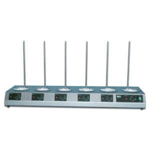 Riscaldatore multiplo mod. BE6: cap. palloni ml 250, peso kg 9.2, dim. est. mm 1060x300x120, potenza res. riscald. W 1080, temp. max. +350, alimentazione V/HZ 230/50-60, precisione piastra ± 5, classe di protezione IP 42, classe di sicurezza 0